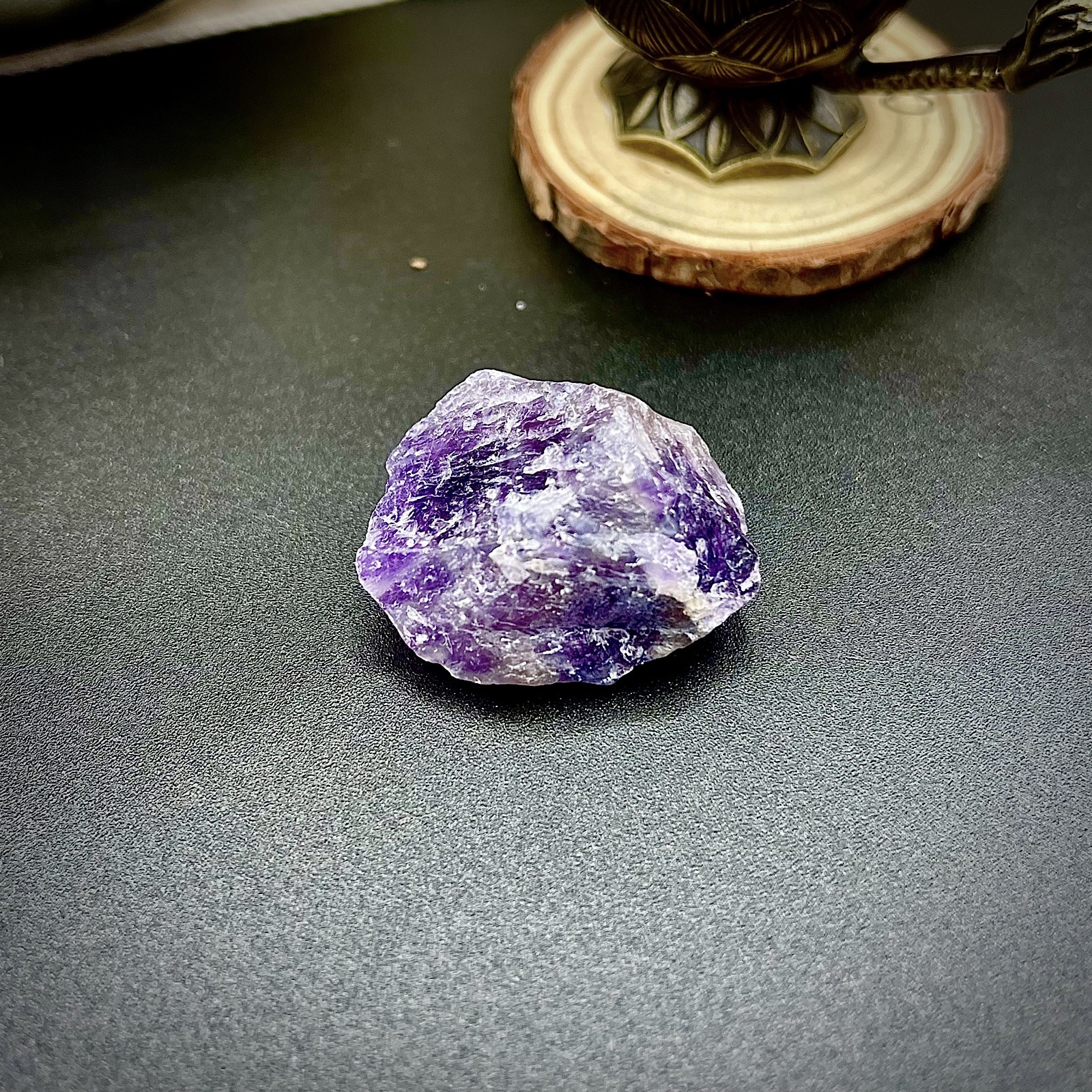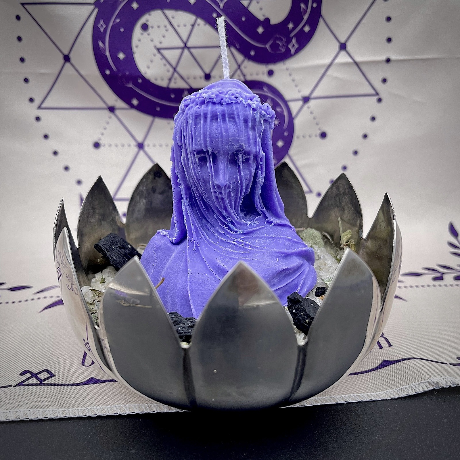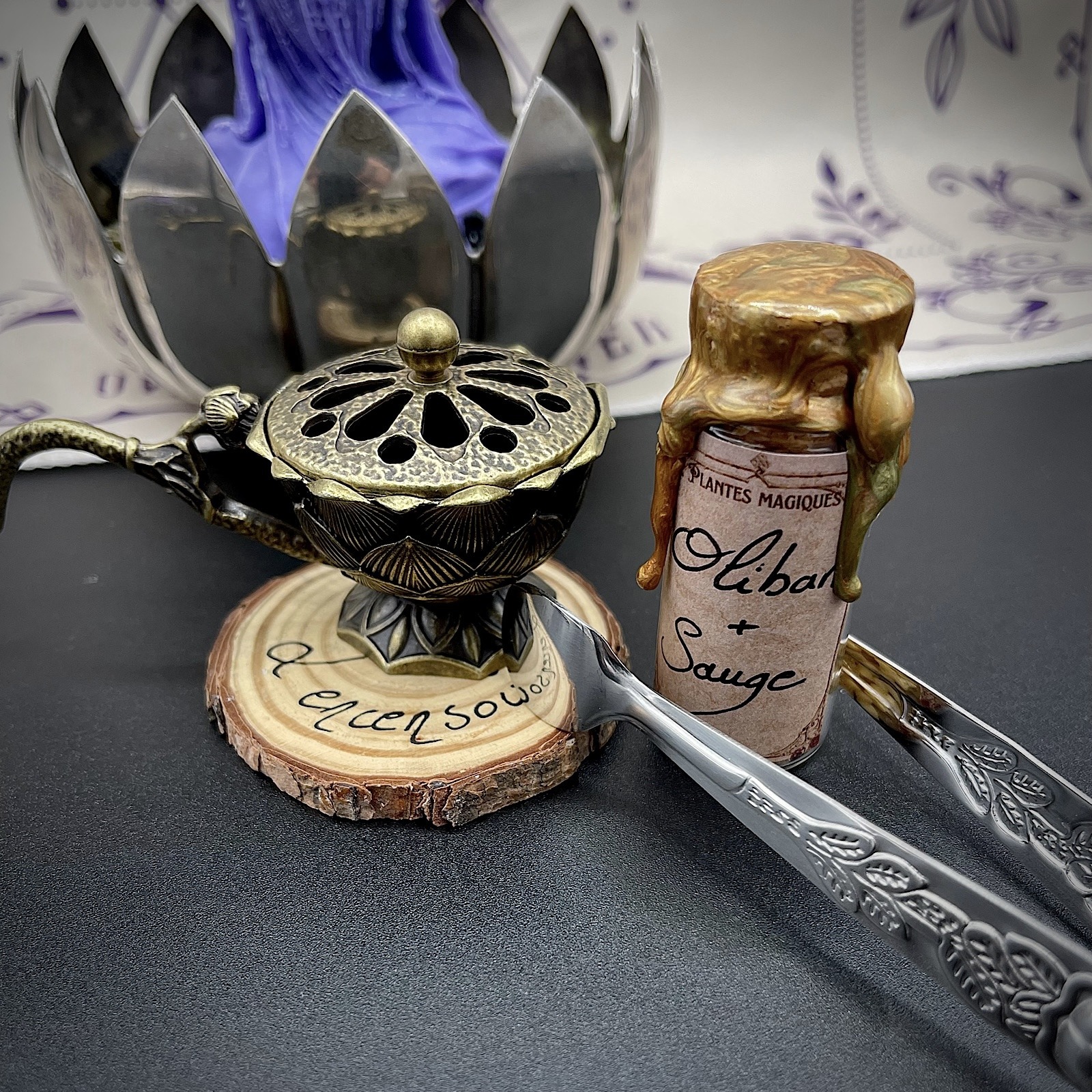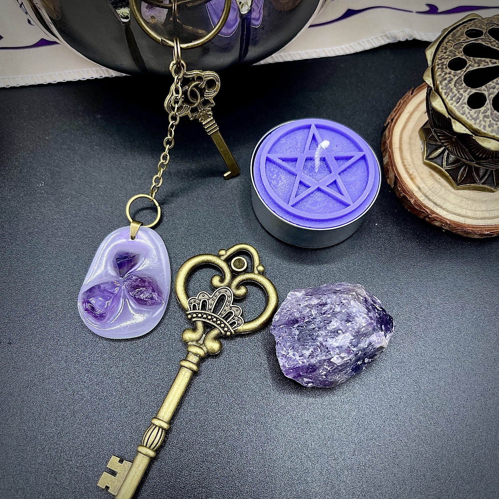Contenu du coffret : Un parchemin guide du sortilège, une bougie Marie faites main, une coupelle en métal rempli de sel noir, une pierre Améthyste, une clé magique, une fiole d’encens d’oliban et de sauge ≃ 3g, un charbon, une pince à charbon, un encensoir, un médaillon époxy incrusté d’améthystes
